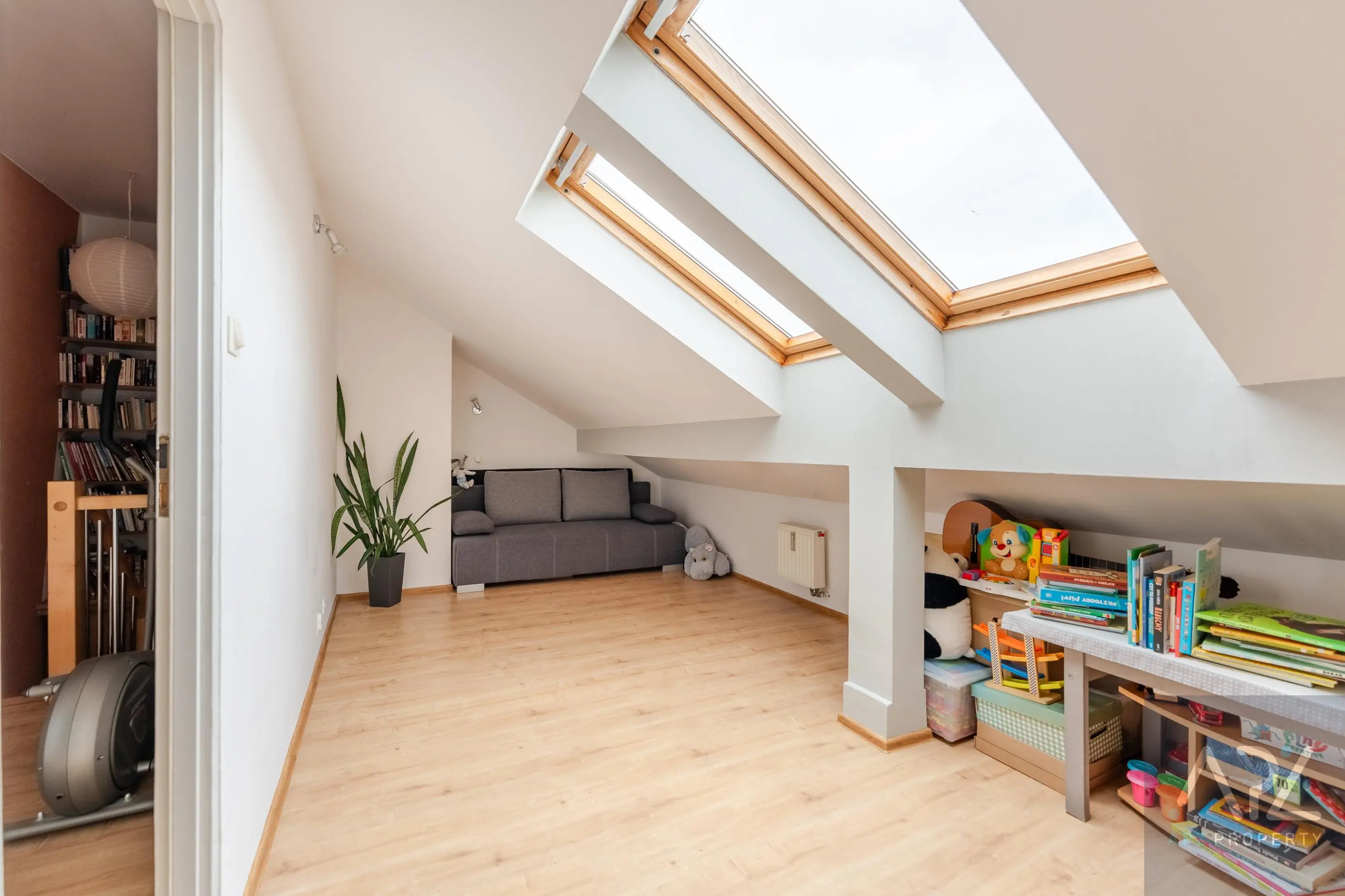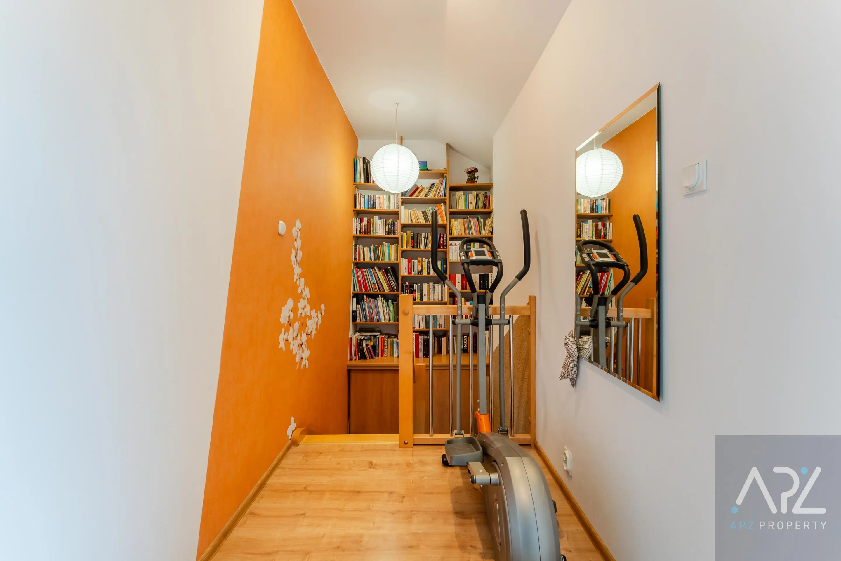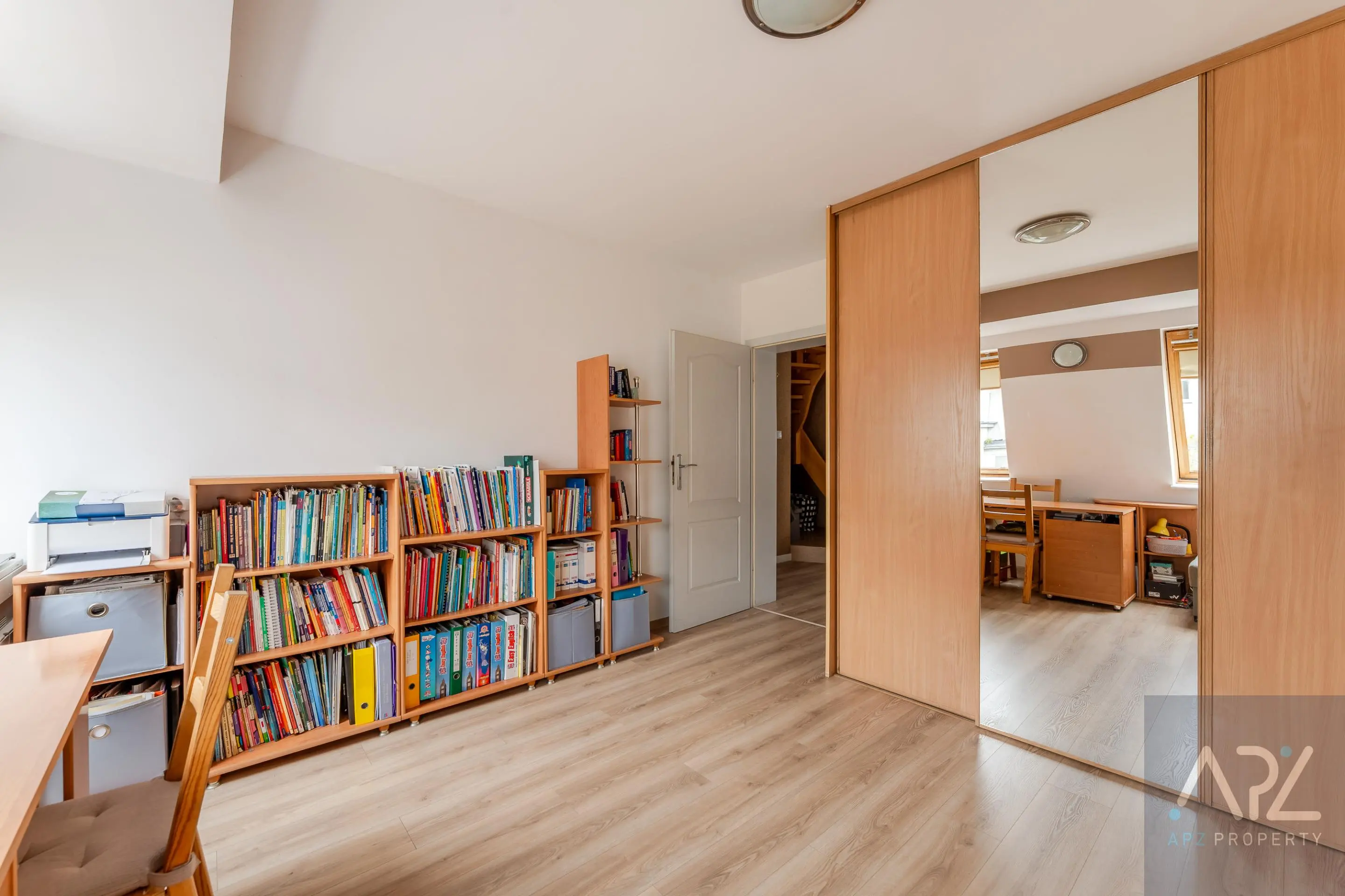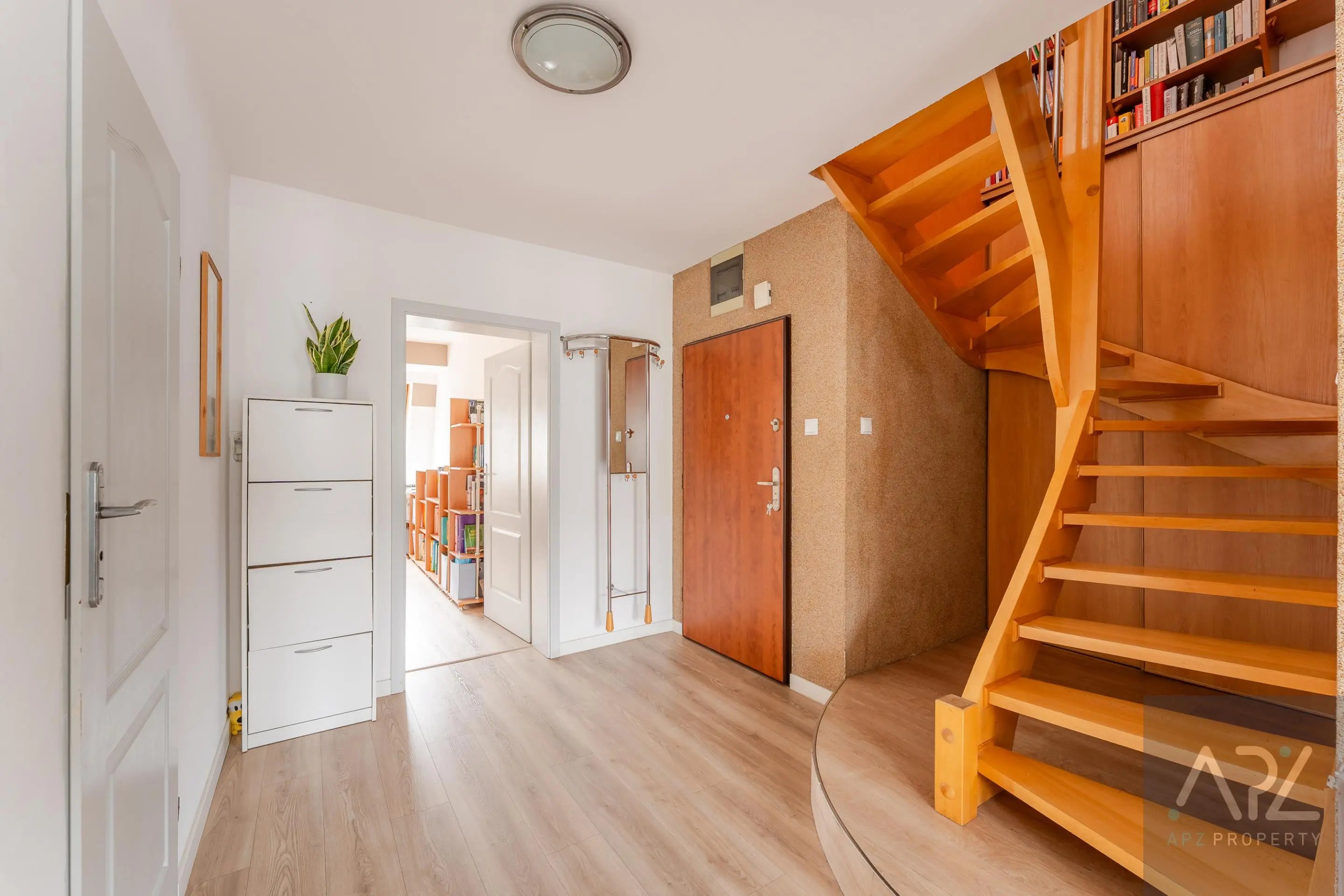 Między I a II poziomem mieszkania, na wysokości schodów znajduje się pojemna i zabudowana szafa oraz biblioteczka.